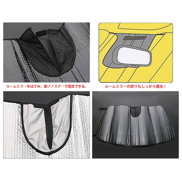 2.シェード上部の切り込み部分はルームミラーを挟み、左右の黒い生地はマジックテープで固定してください。