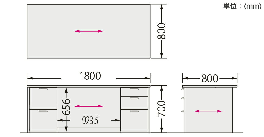 ■ 製品スペック サイズ 奥行(D):800mm×幅(W):1800mm×高さ(H):700mm 重量 108.1kg 仕様 ●天板厚29mm ●引出し:オールロック錠(右袖のみ)・ダブルサスペンションレール(左袖上下段・右袖下段) ●引出し内寸法 (左):上段/W332×D425×H273mm(仕切板1枚)・下段/W332×D425×H280mm(仕切板1枚)・(右):上段/W332×D392.5×H90mm(樹脂ペントレー付) 中段/W332×D392.5×H168mm・下段/W332×D425×H280mm(仕切板1枚) ●アジャスター付 ●天板:木製・メラミン化粧板 ●扉・引出し前板:木製・オレフィン化粧板 ●本体:木製・プリント化粧板