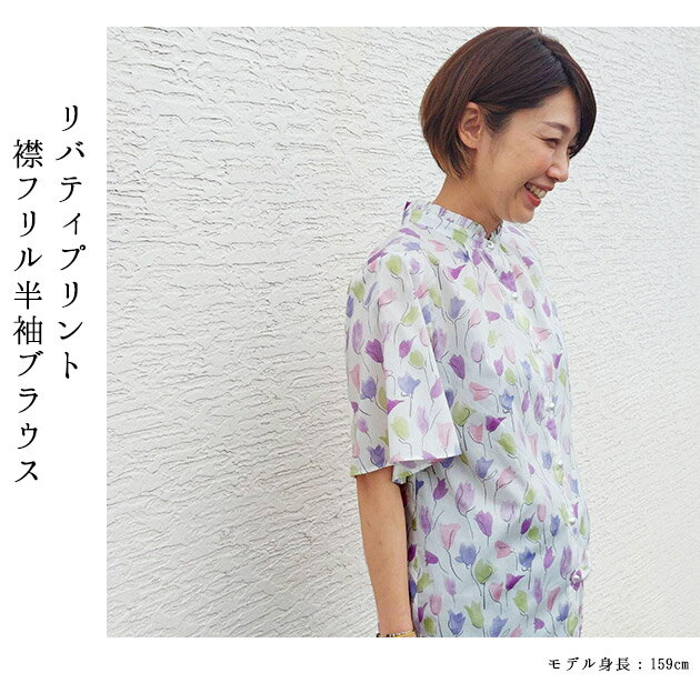 【送料無料】LIBERTY フリル衿半袖ブラウス(チューリップシャドー)ミントラベンダー パープル系 Lサイズ 着心地抜群 ブラウス 大人服 リバティプリント使用